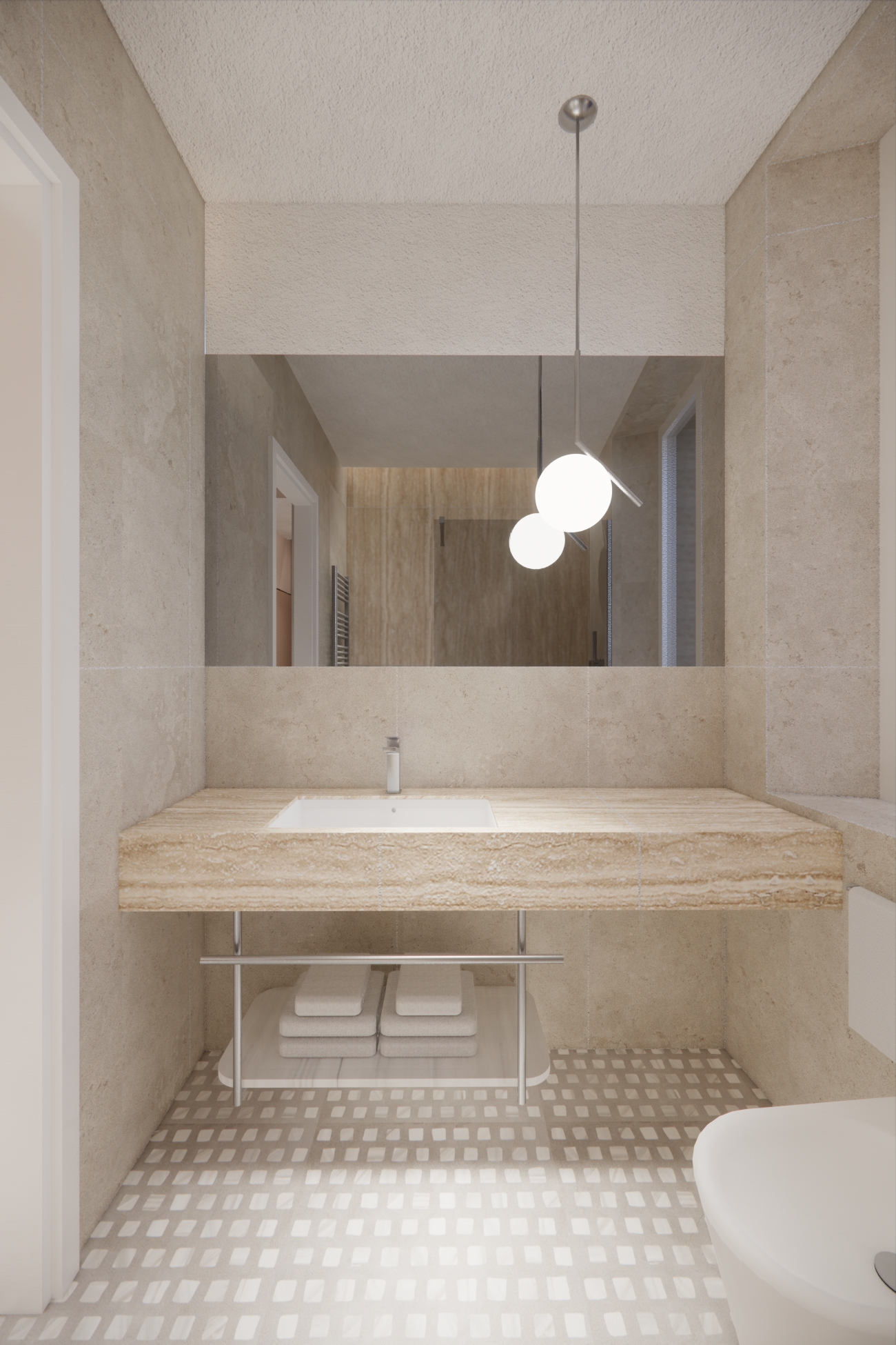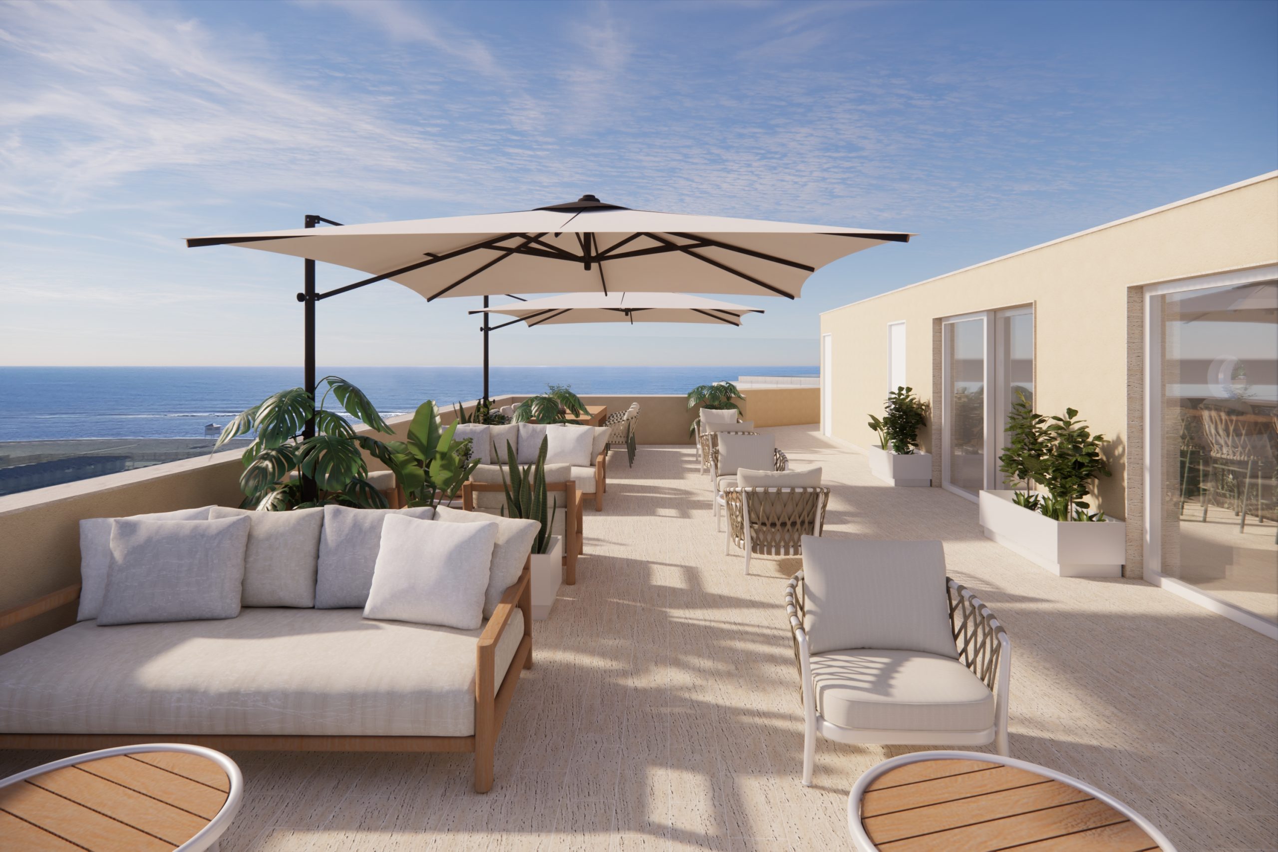 A defining element of the proposal is the rooftop bar with an infinity pool in travertine, imagined as a suspended terrace that enhances the view and becomes a new reference point for the area’s urban and social life.