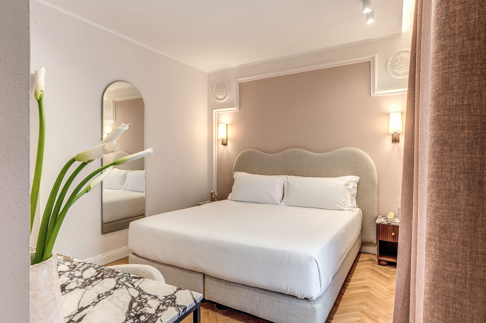 The Hotel Cavalieri Fori Imperiali, located in the heart of Rome’s Monti district just a few steps from the Colosseum and the Imperial Fora, draws inspiration from the area’s rich historical and cultural heritage. Every detail is designed to evoke the beauty of ancient Rome, blending it seamlessly with a contemporary and elegant design language. The guest rooms feature a soft and refined color palette, with delicate ivory and blush pink walls paired with parquet flooring to create a warm and intimate atmosphere. All furnishings are custom-designed, striking a perfect balance between modernity and classicism. The bathrooms are clad in Pavonazzetto marble and onyx, illuminated by LED strips that highlight the textures of the shower surfaces. The communal areas extend the design language of the rooms, featuring travertine floors and a refined combination of wood and marble furnishings. Wavy benches in the breakfast room and bespoke wallpapers depicting Roman ruins complete an immersive experience that celebrates the timeless elegance and history of Rome