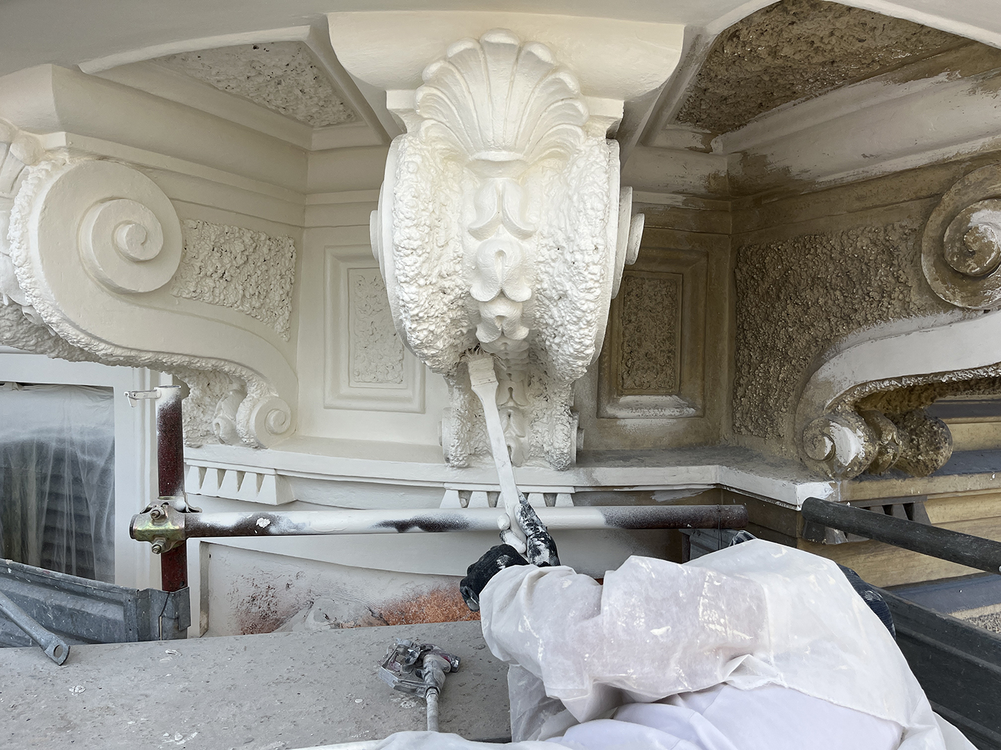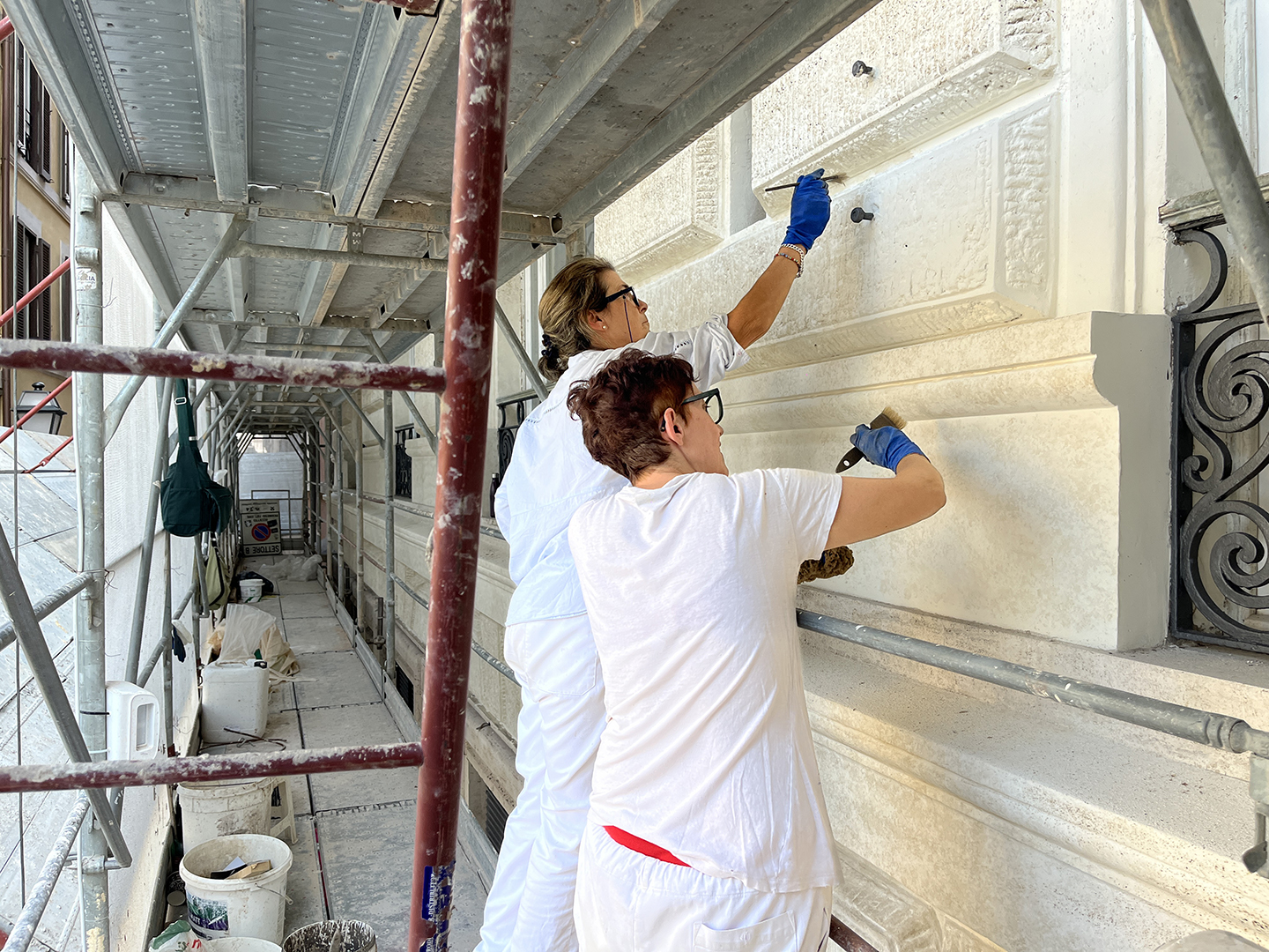 Designed in 1889 by architect Pompeo Passerini, the Palazzo Avogadro e Martel stands as one of the most significant examples of eclectic Roman architecture of the late nineteenth century. The façade, set on a travertine base, is distinguished by stucco window frames and by the crowning fourth floor, enriched with decorative panels featuring putti. The building’s design was part of the broader development of Corso Vittorio Emanuele II, one of the main post-Unification urban projects aimed at redefining the image of the new capital. The conservation restoration project made it possible to recover the original finishes through stratigraphic investigations and material analyses, revealing the faux travertine treatments on the stuccoes and enhancing, through a carefully balanced color palette, the decorative panels with putti crowning the façade. The chromatic and material choices were defined in collaboration with the SSABAP, with the goal of restoring the building’s authentic appearance and its original decorative richness.