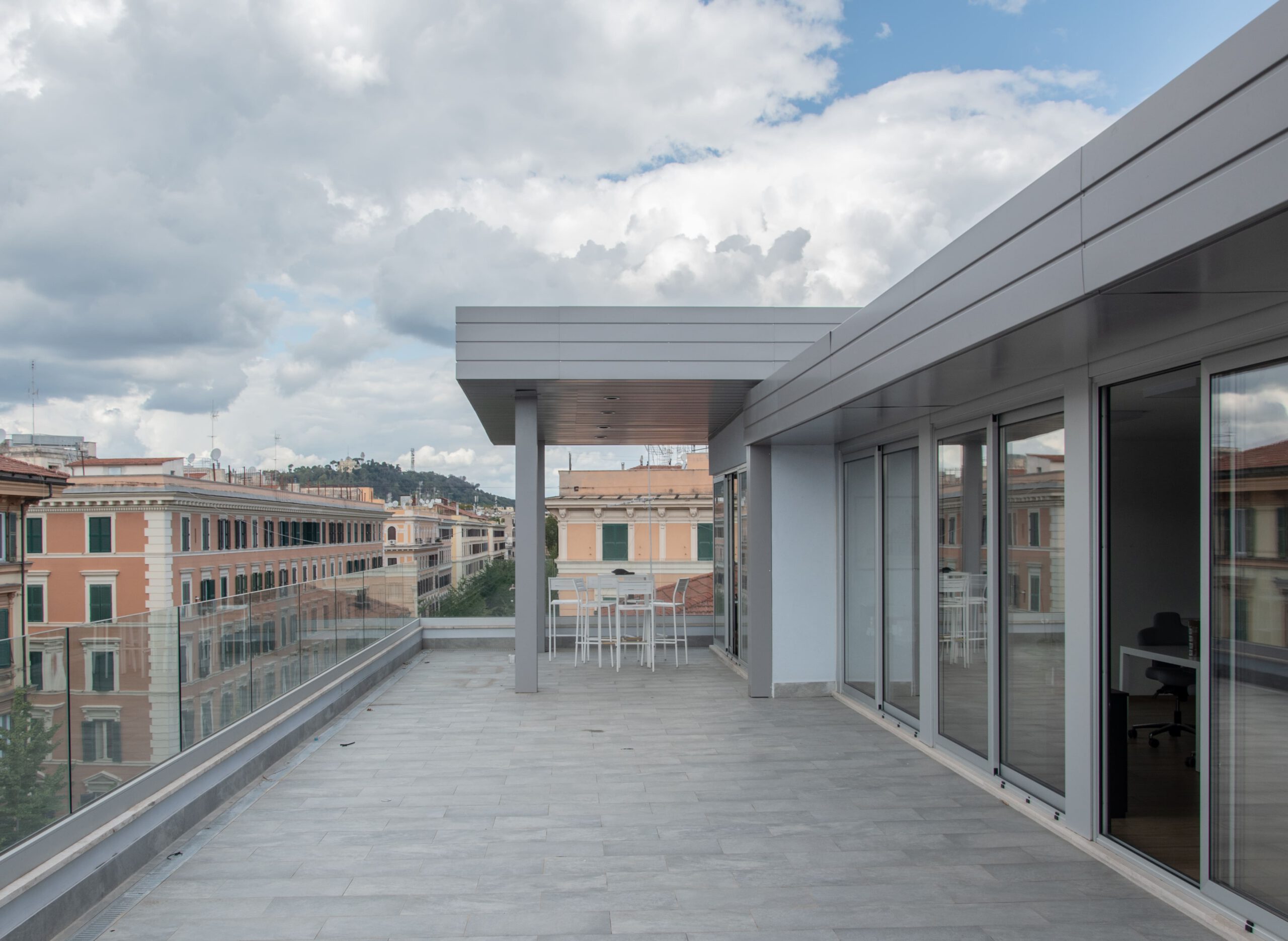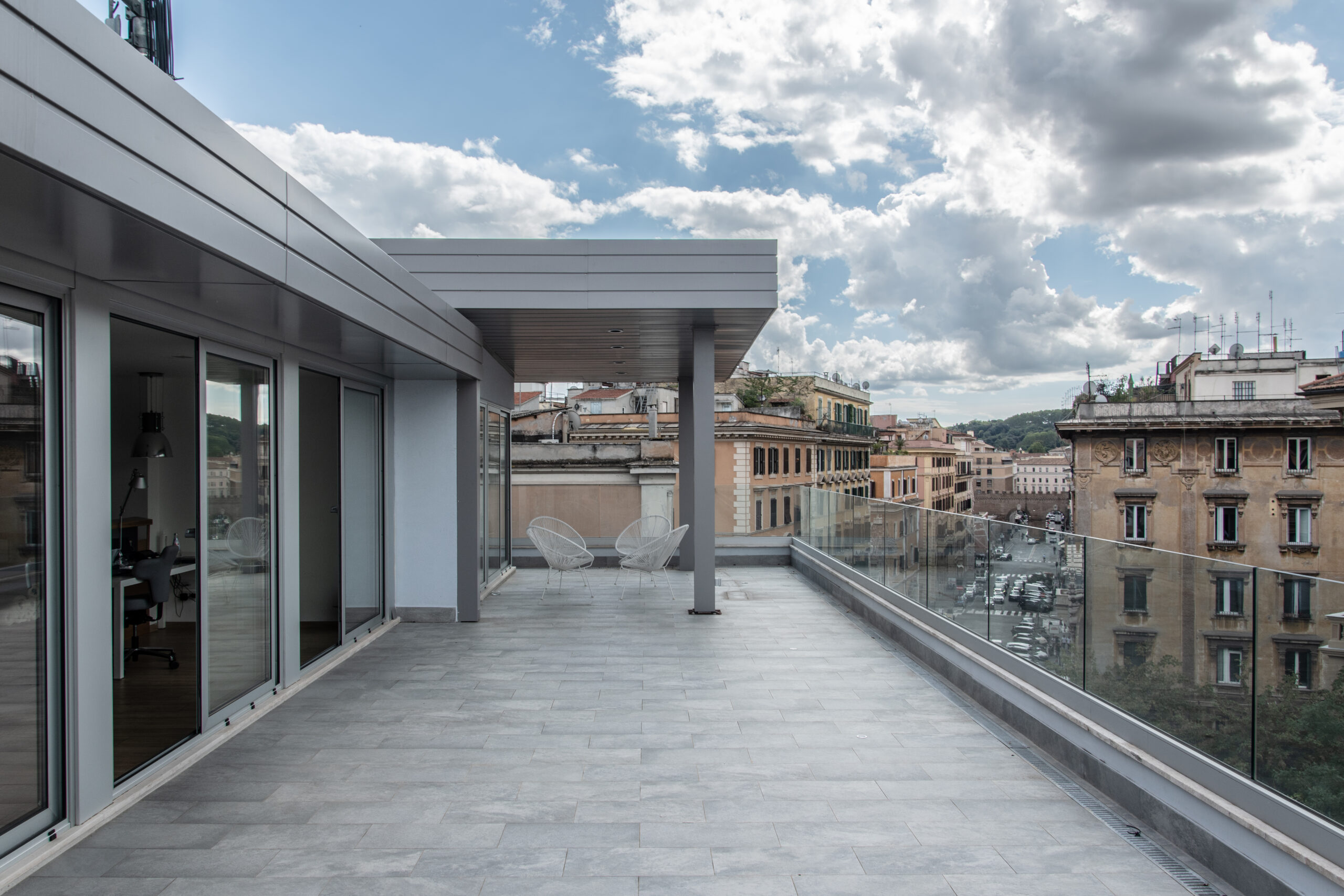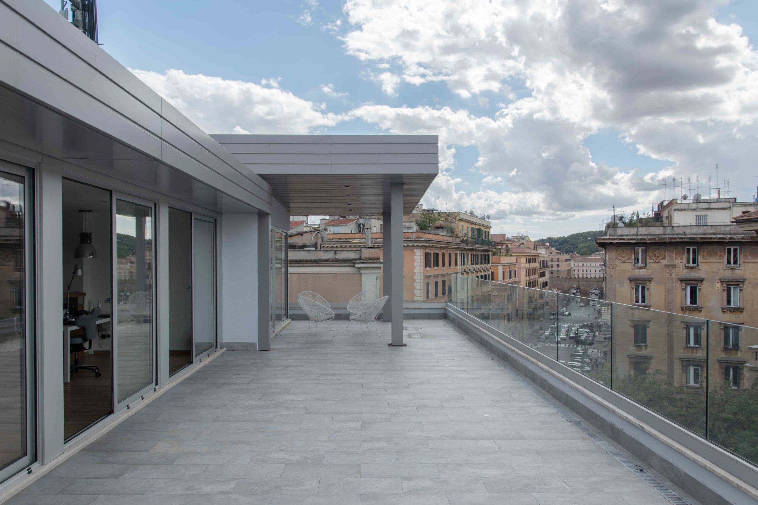 The project involved the extension of an office building located just a few steps from Castel Sant’Angelo, through the construction of a new floor of approximately 200 m² using a dry-assembled steel structure. At the same time, the intervention lightened the overall volume of the building by removing slabs and accumulated materials that had weighed it down over time, restoring a more slender and harmonious character in contrast to the compositional variety typical