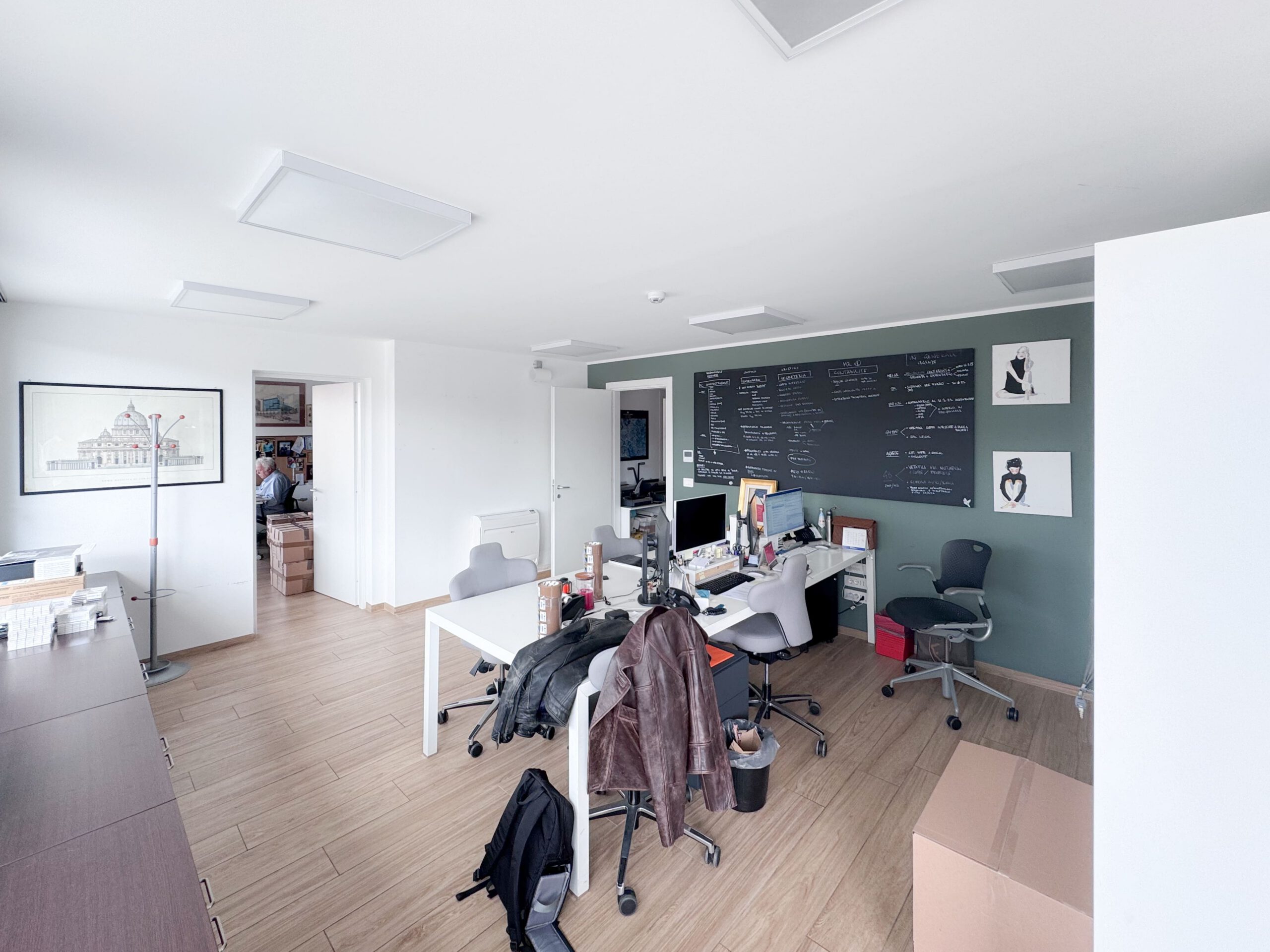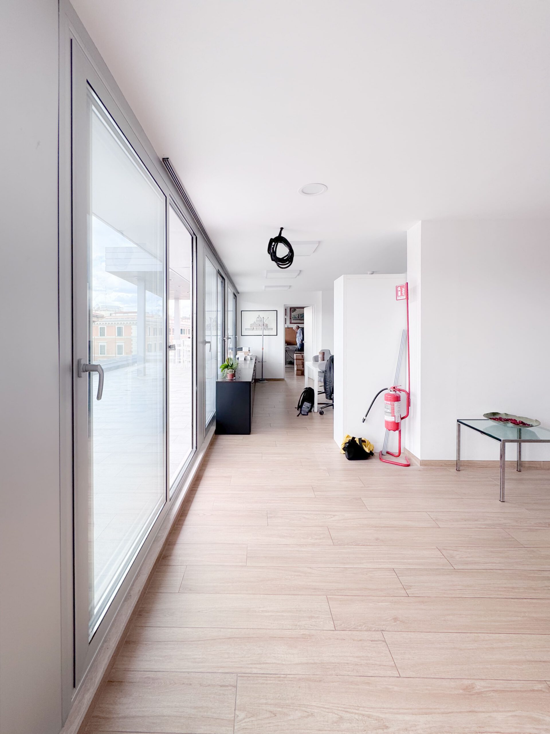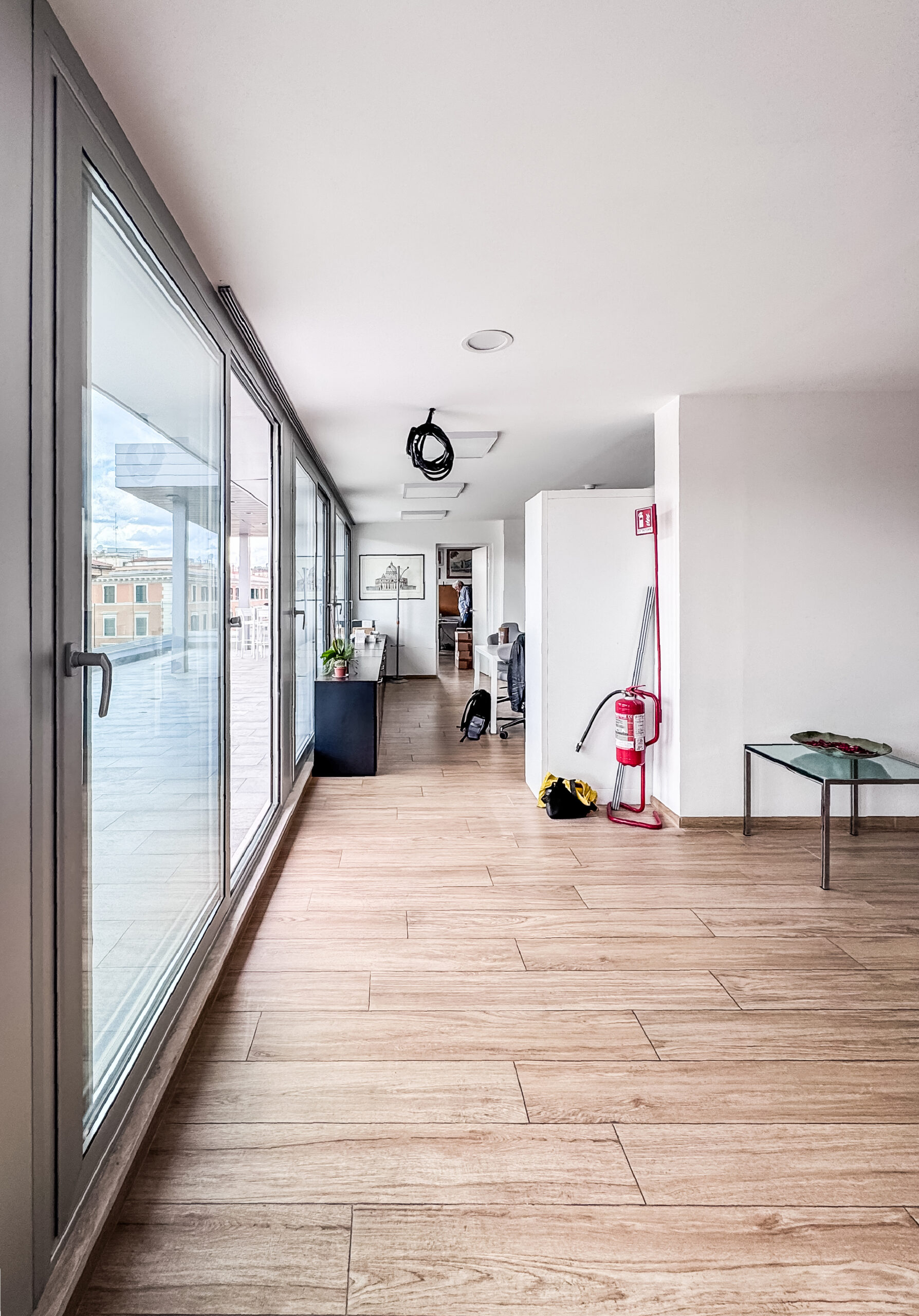 Il progetto ha riguardato l’ampliamento di un edificio per uffici situato a pochi passi da Castel Sant’Angelo, attraverso la costruzione di un nuovo piano di circa 200 m² con struttura in acciaio assemblata a secco. Allo stesso tempo, l’intervento ha alleggerito il volume complessivo dell’edificio, rimuovendo solette e materiali accumulati che lo avevano appesantito nel tempo, restituendogli un carattere più snello e armonioso, in contrasto con la varietà compositiva tipica dell’architettura degli anni ’70. Il progetto prevede anche l’installazione di un ascensore con accesso dedicato, mentre il restyling complessivo è iniziato dall’atrio e si estenderà progressivamente ai piani superiori.